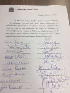 O documento, que reúne 26 assinaturas até o momento, e pede a manutenção da deputada federal Tereza Cristina (MS) à frente da liderança do partido na Câmara dos Deputados, explicita a unidade do bloco, mesmo com correntes de pensamentos divergentes no âmbito das reformas propostas pelo Governo.