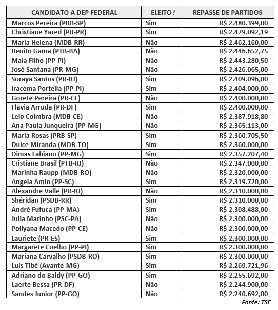 Entre os 30 candidatos a deputado federal que mais receberam recursos de partidos, 16 foram eleitos. Na lista dos que conseguiram recursos, mas não tiveram sucesso nas urnas, há políticos com mandato, como Cristiane Brasil (PTB-RJ), Lelo Coimbra (MDB-ES) e Laerte Bessa (PR-DF).