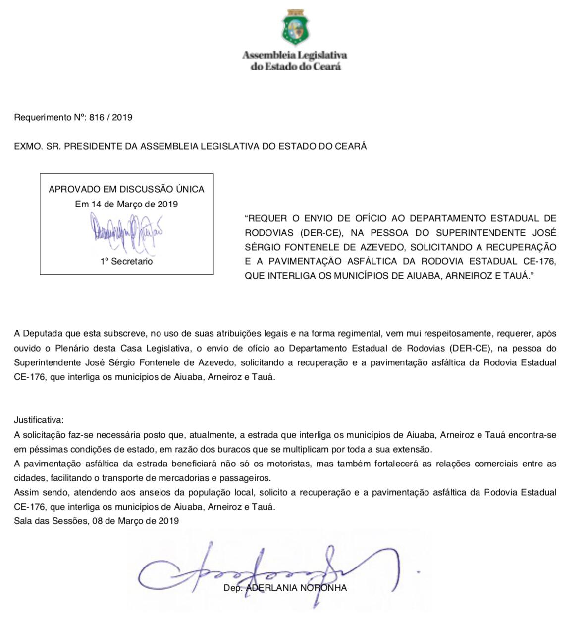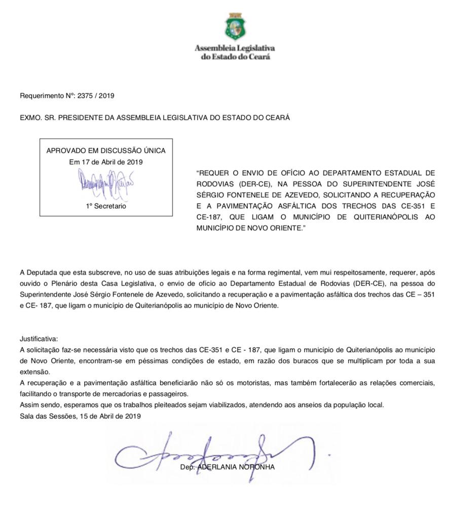 Atendendo à solicitação da deputada estadual Aderlânia Noronha (SD), o governador Camilo Santana incluiu, no pacote de obras de recuperação e pavimentação das estradas e rodovias, os trechos das CE-351 e CE-187, que ligam o município de Quiterianópolis ao município de Novo Oriente, bem como trechos da CE-176, que interligam os municípios de Aiuaba, Arneiroz e Tauá.