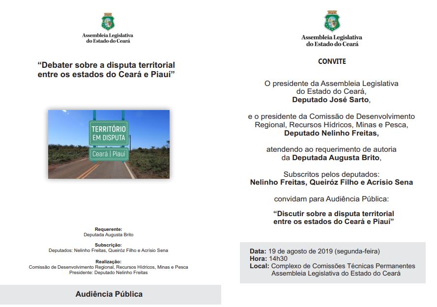 A deputada Augusta Brito, Coordenadora do Projeto Atlas de Divisas Municipais Georreferenciadas do Estado do Ceará, realiza na próxima segunda-feira, 19 de agosto, audiência pública no Complexo das Comissões Técnicas da Assembleia Legislativa, para discutir a divisa territorial entre Ceará e Piauí. O evento acontece às 14h30min.