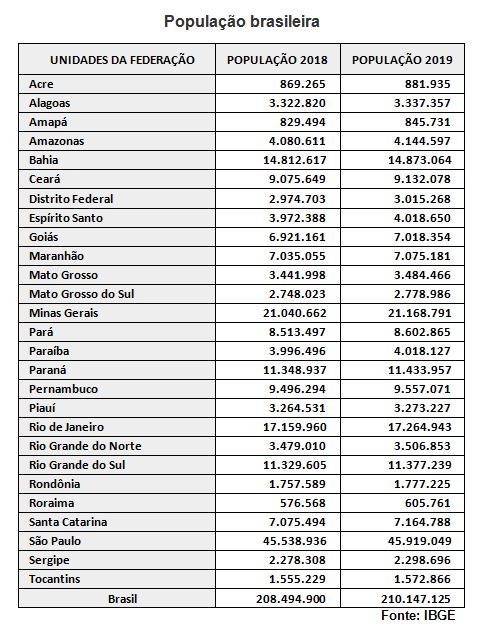 A população brasileira foi estimada em 210,1 milhões de habitantes, segundo o Instituto Brasileiro de Geografia e Estatística (IBGE). A estimativa com o total de habitantes dos estados e dos municípios se refere a 1° de julho de 2019 e foi publicada no “Diário Oficial da União” desta quarta-feira (28).