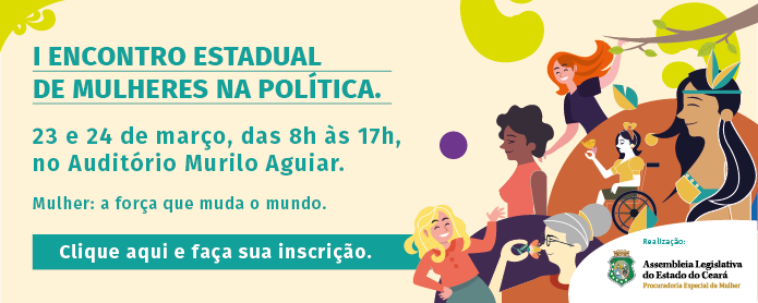 Estão abertas as inscrições para o I Encontro Estadual de Mulheres na Política realizado pela Assembleia Legislativa do Ceará, por meio da Procuradoria Estadual da Mulher. O evento acontecerá nos dias 23 e 24 de março, de 8h às 17h, no Auditório Murilo Aguiar. As inscrições são gratuitas e podem ser feitas no site da Casa.
