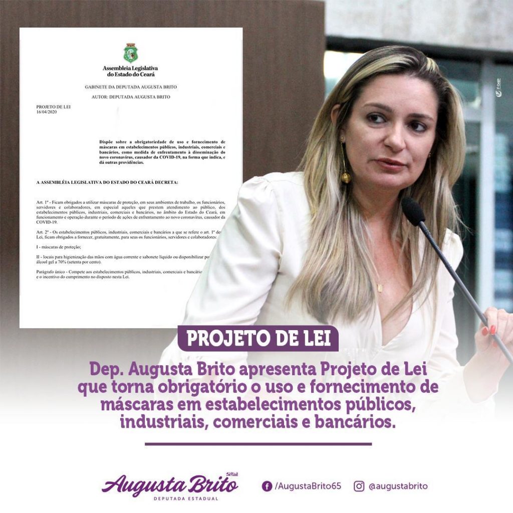 Projeto de lei de autoria da Deputada Augusta Brito apresentado na Assembleia Legislativa (PL 110/2020) dispõe sobre a obrigatoriedade de uso e fornecimento de máscaras e local para higienização das mãos, com água e sabão ou álcool em gel, em estabelecimentos públicos, industriais, comerciais e bancários, em especial os que prestem atendimento ao público, como medida de enfrentamento à disseminação do novo coronavírus.