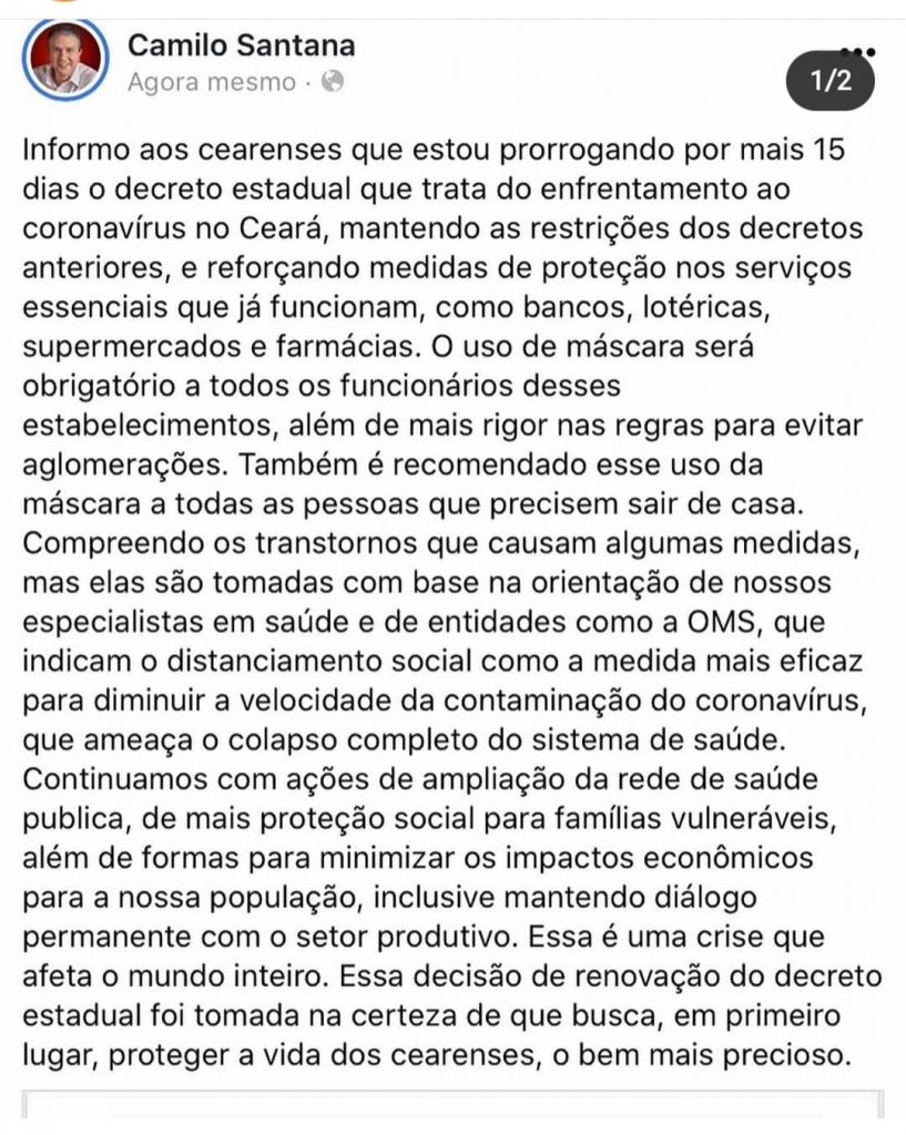 Nas redes sociais, Camilo Santana anunciou que manterá as restrições dos decretos anteriores e recomenda o uso de máscaras para todas as pessoas que precisarem sair de suas casas. Afirmou também que continuará com ações de ampliação da rede de saúde pública, de mais proteção social para famílias vulneráveis e também formas para minimizar os impactos econômicos para a população.